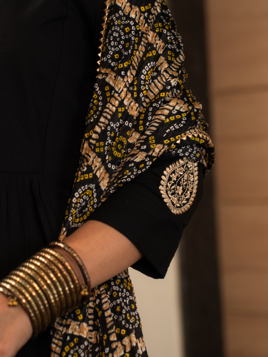 Elevate your ethnic charm with this elegant Black Rayon Suit, beautifully adorned with intricate Pittan work. Crafted from soft and breathable rayon fabric, this suit offers both comfort and style, making it perfect for festive occasions, family gatherings, and celebrations. The kurta features delicate hand Pittan embroidery that adds a touch of traditional artistry and shimmer to the deep black base. It is paired with a matching bottom and a complementing dupatta, completing the graceful ensemble.
