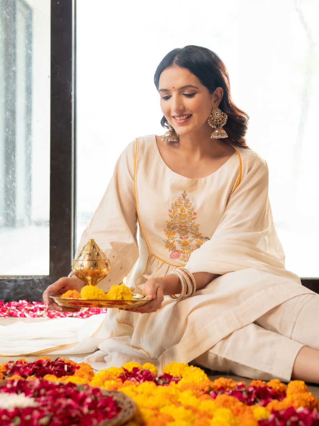 Effortlessly elegant and timelessly stylish, this Classic Off-White Cotton Kurta Set is a wardrobe essential for every season. Crafted from soft, breathable cotton, the kurta features delicate embroidery detailing that adds a touch of understated sophistication. The straight-cut silhouette offers a flattering fit, while the intricate threadwork—placed gracefully along the neckline, sleeves, and hem—lends an artisanal charm. Paired with matching cotton pants and a lightweight dupatta, this set is perfect for day-to-evening wear.