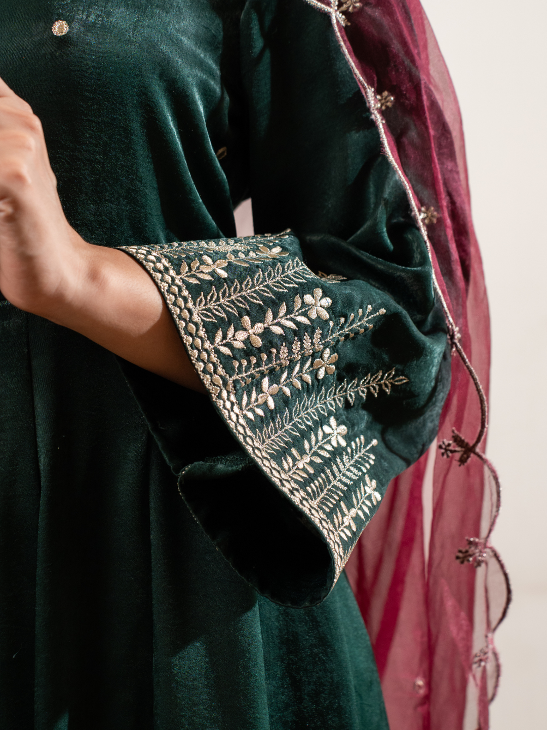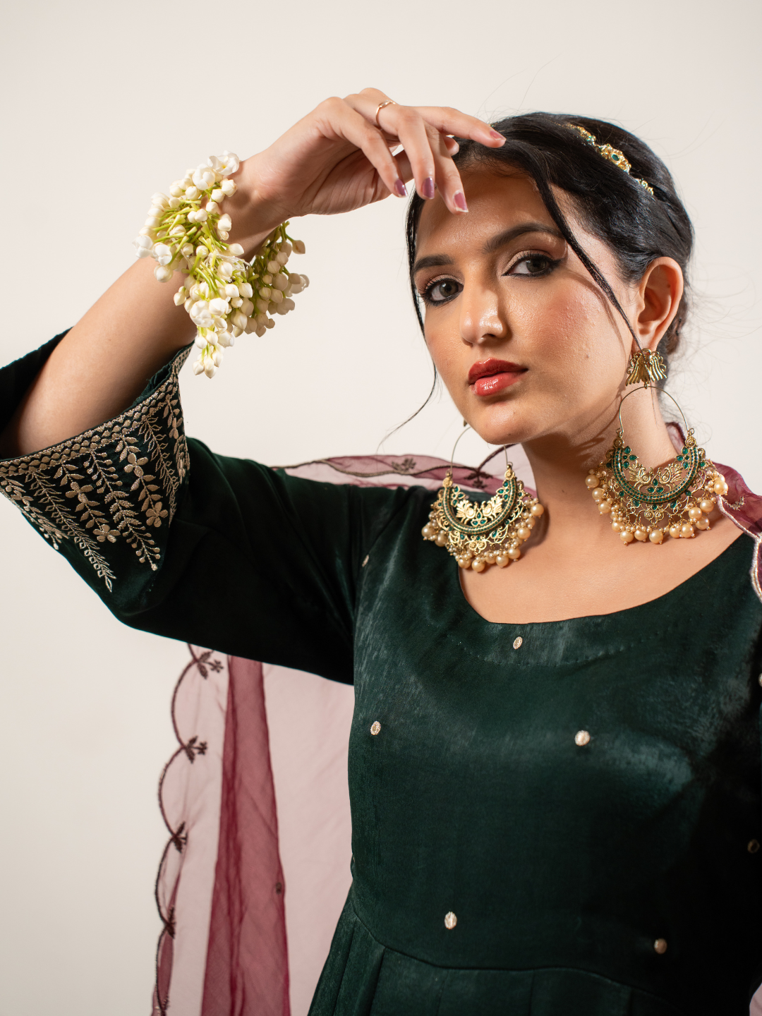 Step into timeless elegance with this stunning Green Velvet Satin Anarkali, exquisitely embellished with intricate embroidery work. The luxurious blend of velvet and satin fabric gives it a rich texture and graceful fall, making it a perfect choice for festive occasions, weddings, and celebrations.